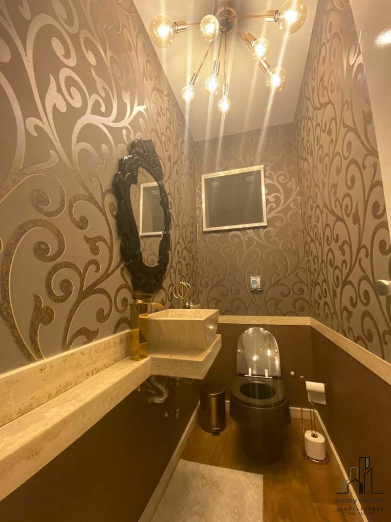 • 1° Pav. Ampla sala em três ambientes, lavabo, banheiro social, ampla cozinha com armários planejados, dependência completa de empregada e área de serviço.