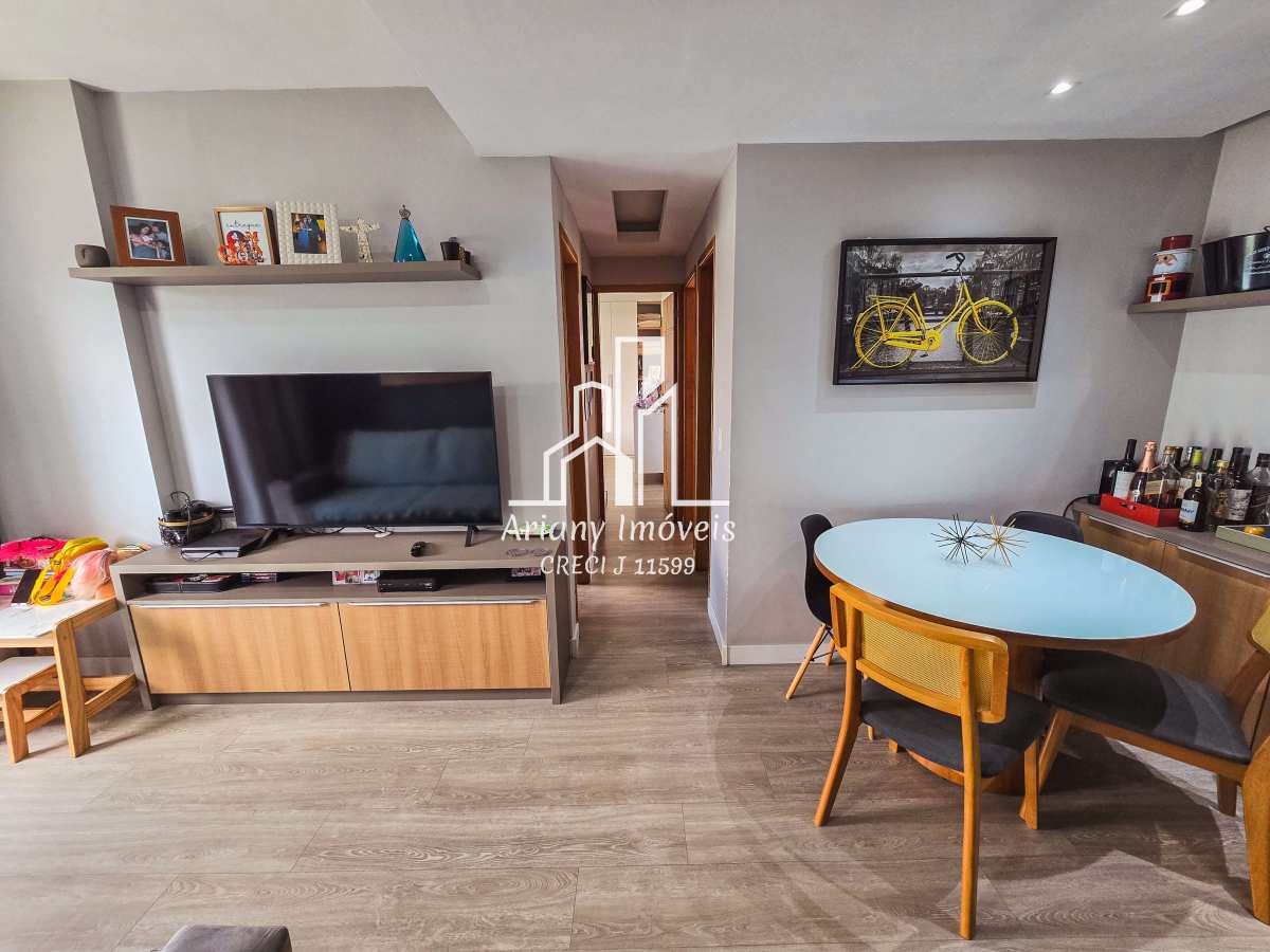 Sala em dois ambientes, varanda, cozinha com área de serviço, banheiro social, três quartos, sendo uma suíte.