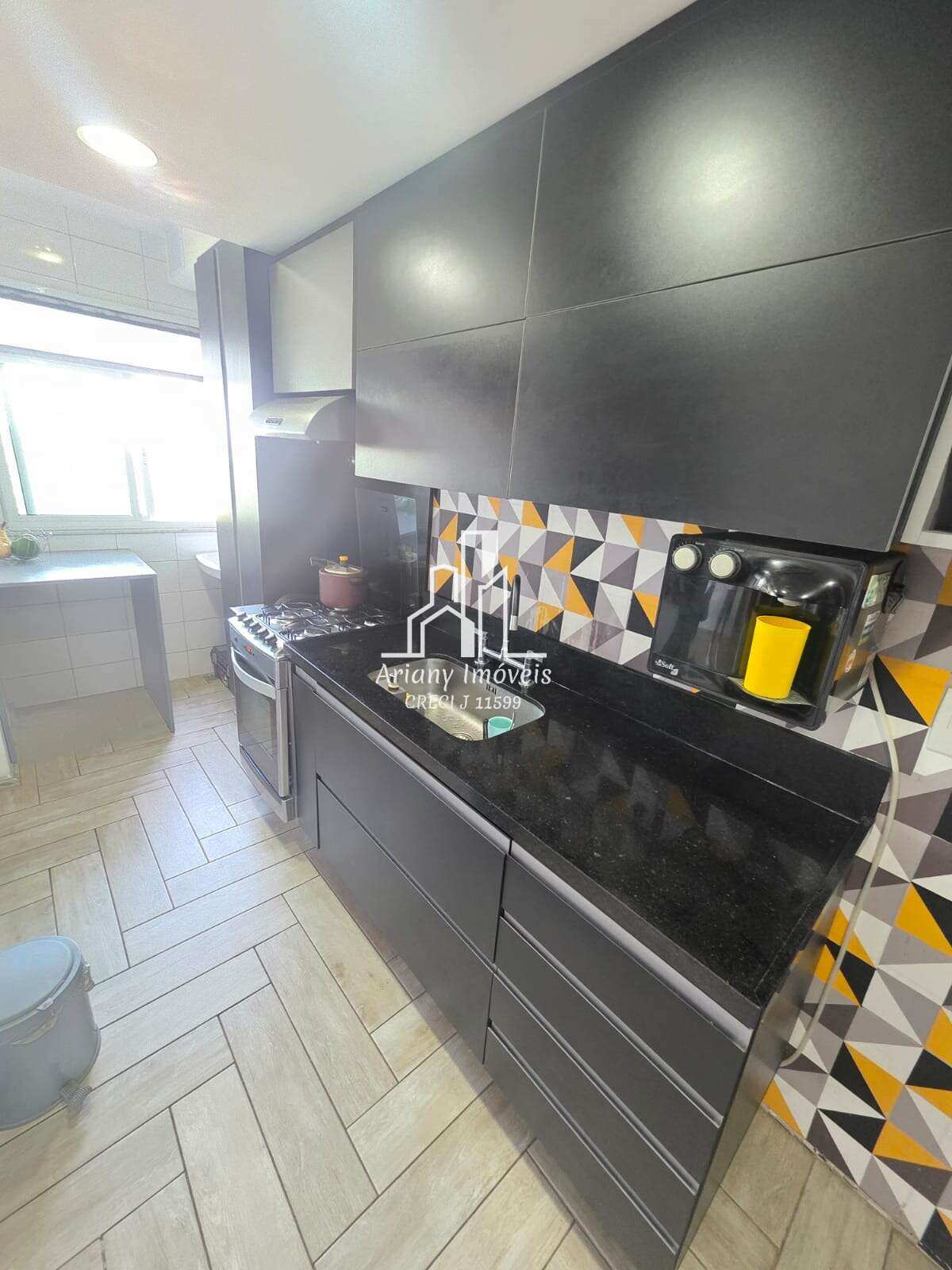 Sala em dois ambientes com varanda integrada, cozinha com área de serviço, banheiro social e dois quartos, sendo uma suíte