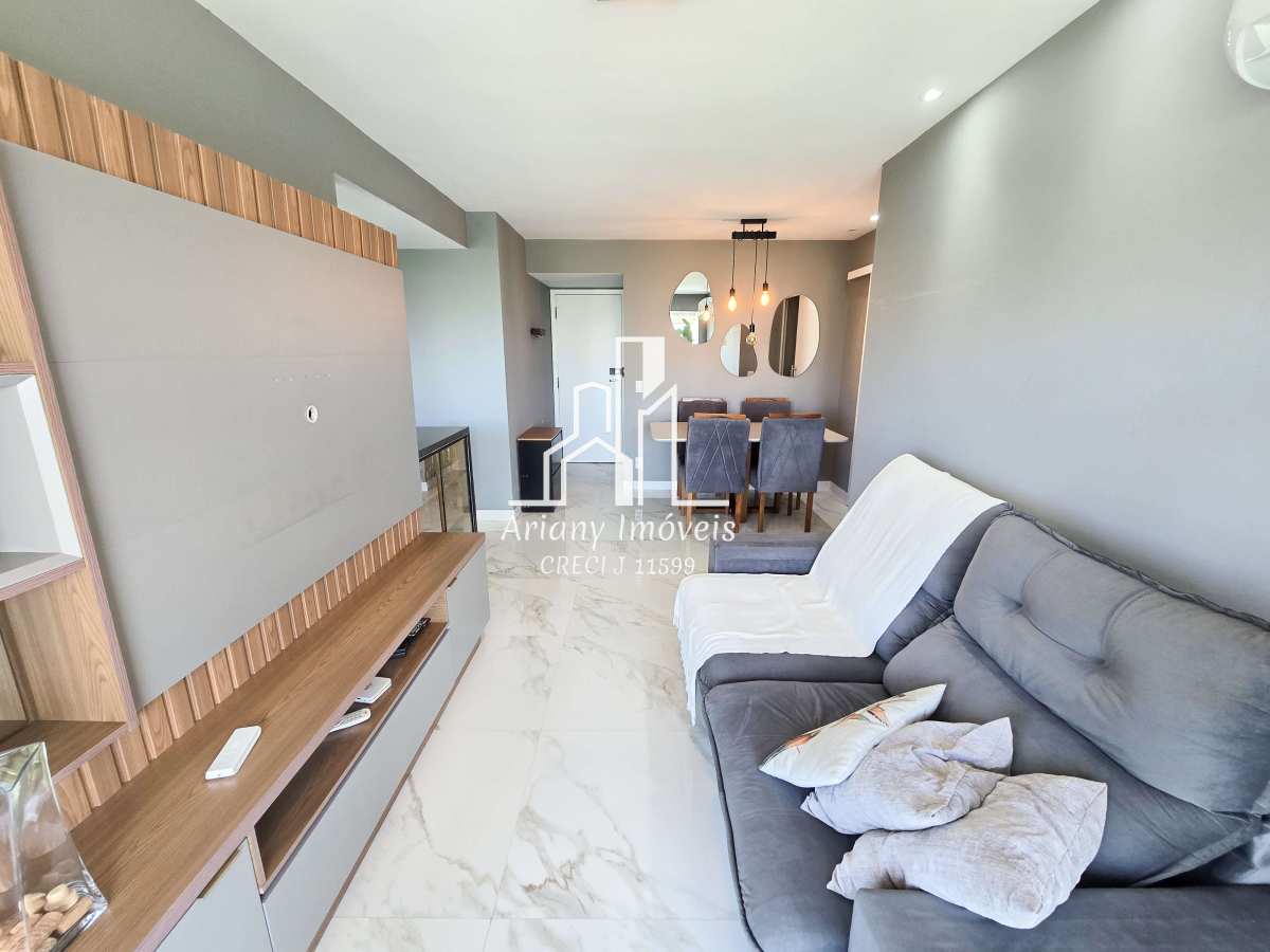 Sala em dois ambientes com varanda integrada, cozinha com área de serviço, banheiro social e dois quartos, sendo uma suíte com closet
