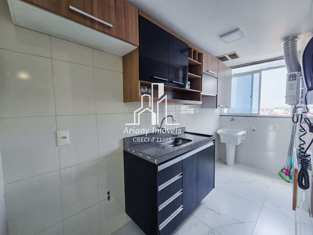 Sala em dois ambientes, varanda, cozinha com área de serviço, banheiro e dois quartos