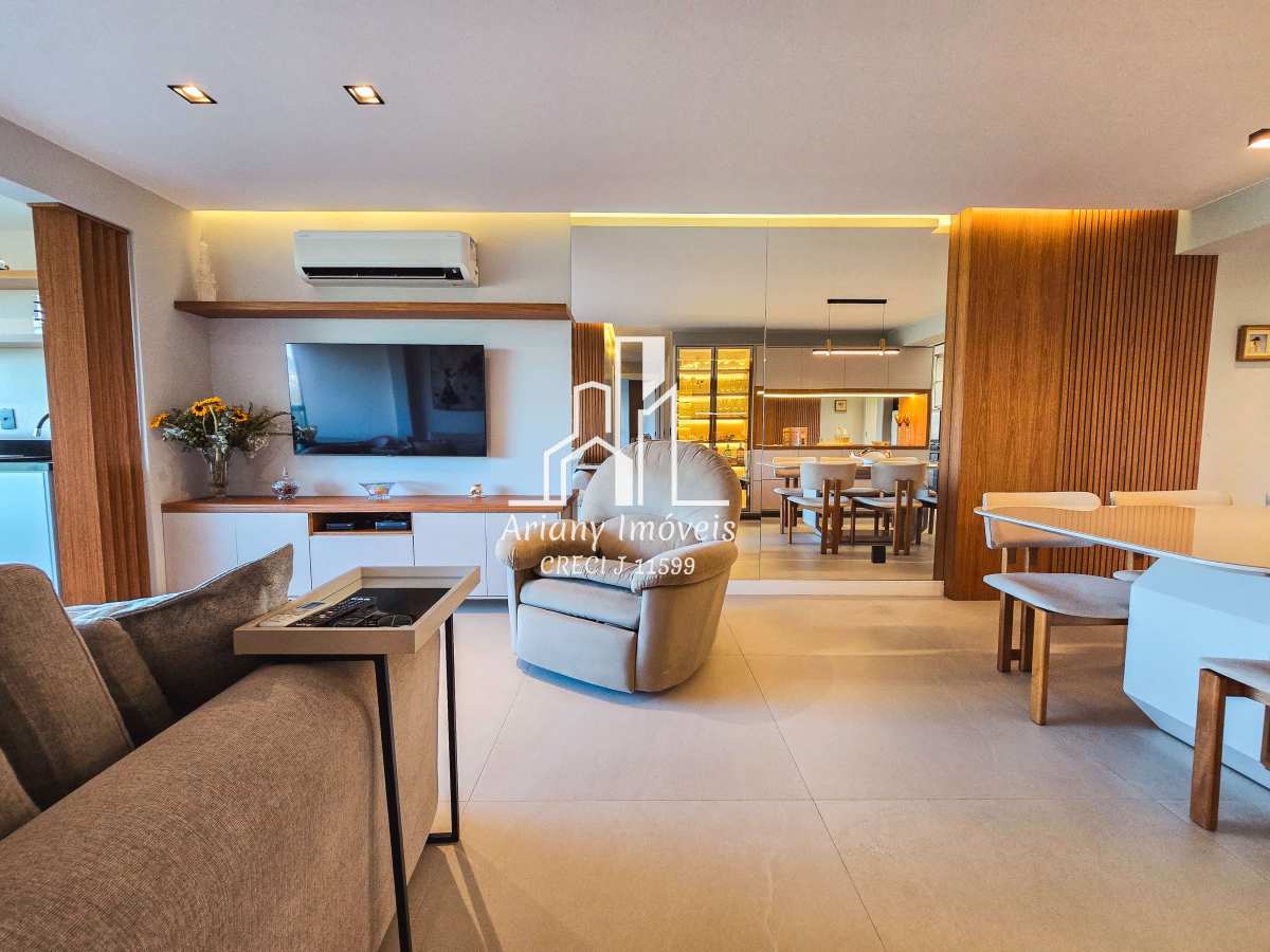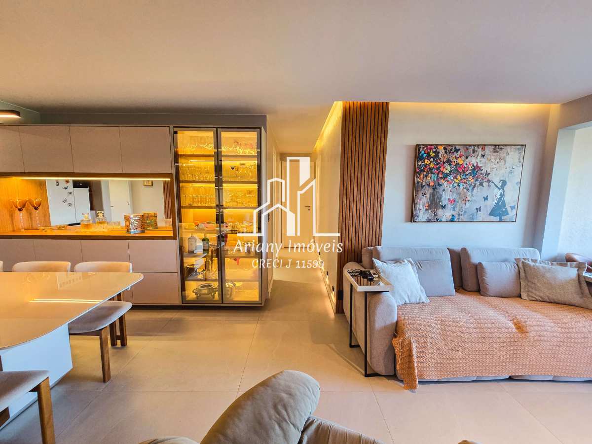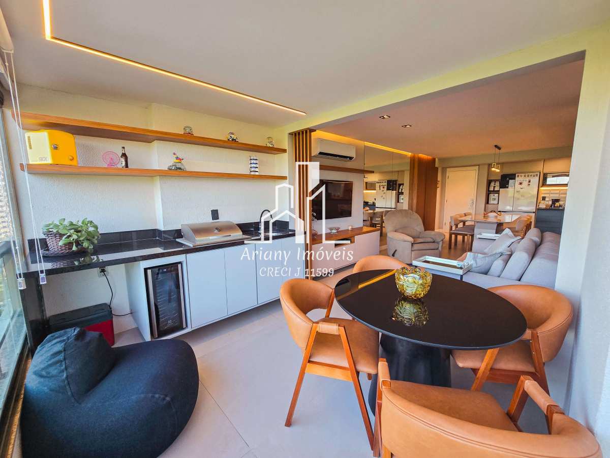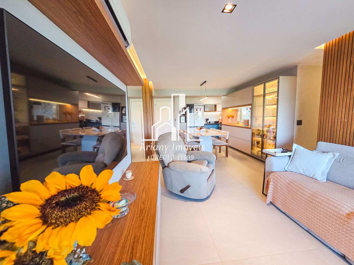 Sala ampla em dois ambientes integrada com varanda gourmet, cozinha em conceito aberto, área de serviço, banheiro e três quartos, sendo uma suíte e banheiro de serviço