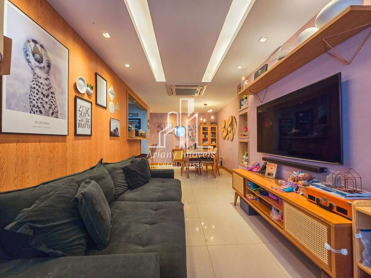 Sala em dois ambientes, varanda integrada, cozinha em conceito aberto, área de serviço, banheiro e três quartos, sendo uma suíte